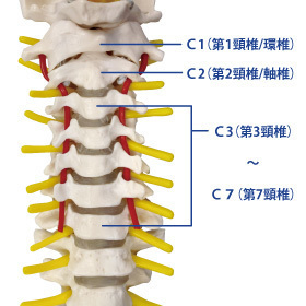 図にもありますが、第一頸椎から第七頸椎の7つの骨がありそれらが重なって頭を支えています。