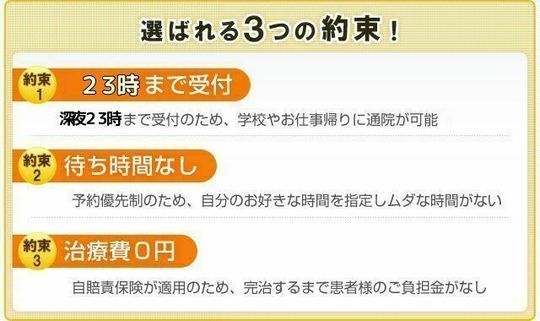 当院は横浜市内でも数少ない深夜23時まで診療している整骨院です。夜間対応なので仕事で遅くなっても継続して通院出来る環境を整えています。