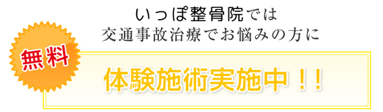 そこで当院では患者様が納得した状態で治療を受けて欲しいと考え『交通事故の無料体験治療』を実施する事にしました。